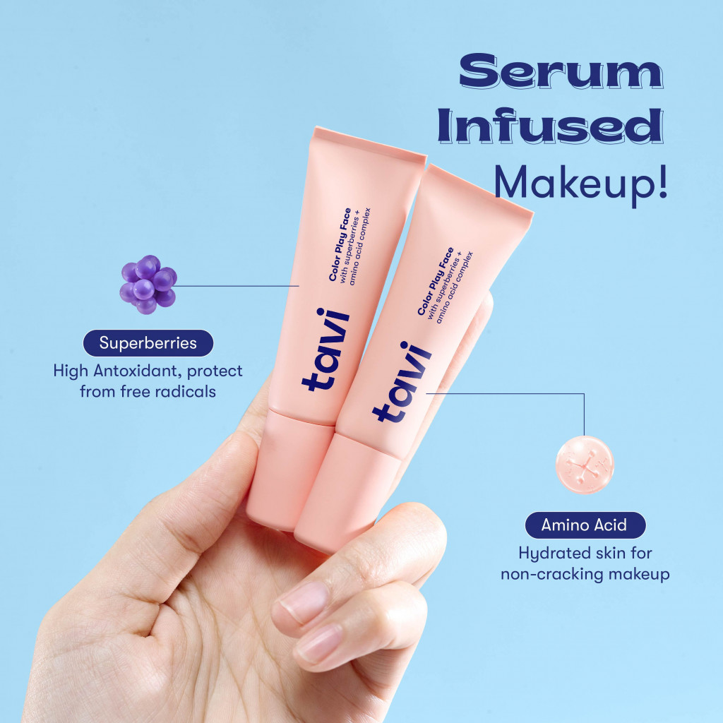 New! Tavi Color Play Face Tint is a serum-infused blush & highlighter that gives you a second-skin finish all day long. A hybrid of makeup and skincare, packed with Amino Acid + Superberries gives you a smooth plump finish. A necessity for a flushed daily look!